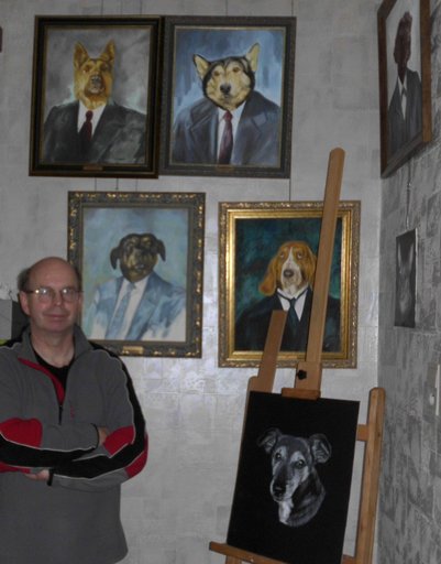 I am Ronny Bijnens, born in Zutendaal in 1955. My father taught me the love for drawing from childhood. A little while ago I took some lessons in oil-painting by a local artist Jozef Housen, an exceptionally talented painter in snowscapes. He and his wife Roza encouraged me to follow the same road. Without his tips and advice I wouldn't be where I am now in this short time. In my anthropomorphic portraits I always try to attain the personality of the human with the character and dignity of the dog's head. It are neither dogs with a human body nor humans with a dog's head. It are creatures out of a phantasy-world, self-assured aristocrats with an intense emanation and a strong personality. I leave it to you to judge if I accomplish in that goal!